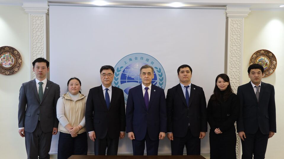 2026 年 2 月 10 日,上海合作组织秘书长叶尔梅克巴耶夫在秘书处会见上海交通大学医学院附属瑞金医院院长、中国工程院院士宁光。
