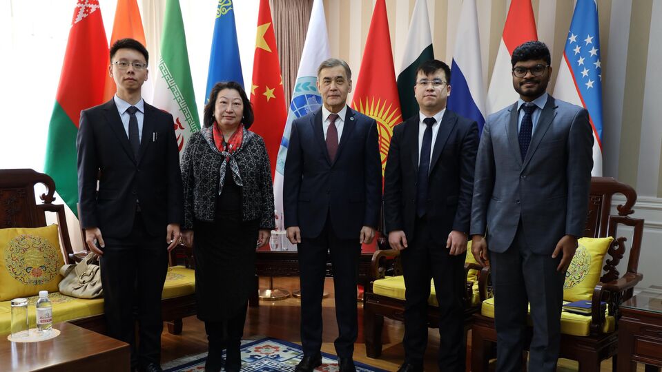 2026 年 2 月 13 日,上海合作组织秘书长叶尔梅克巴耶夫在秘书处会见国际调解院秘书长郑若骅。