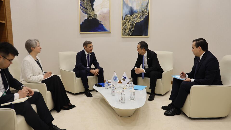 2026年4月22日,在哈萨克斯坦阿斯塔纳举行的区域生态峰会期间,上海合作组织秘书长叶尔梅克巴耶夫与欧亚经济委员会执委会主席萨金塔耶夫举行会晤。